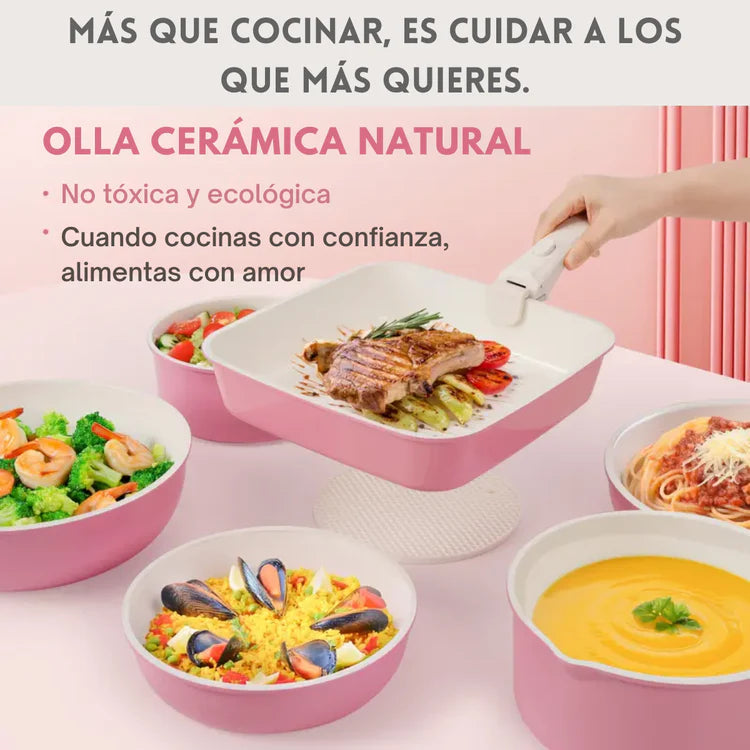 Su recubrimiento 100 % cerámico natural es libre de PFAS, PFOA, plomo y cadmio, lo que significa que puedes cocinar para tu familia sin preocuparte por tóxicos o residuos dañinos.